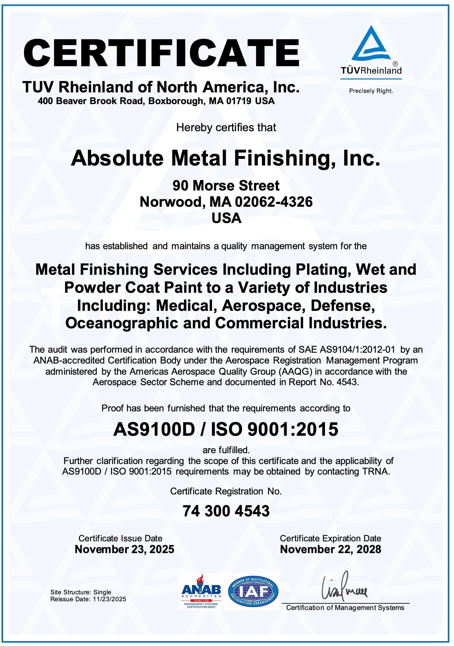 For over five decades, we have been serving our customers with Quality Metal Finishing Services including plating, wet and powder coat paint to a variety of industries including: medical, aerospace, military, oceanographic and commercial industries. Our skills and expertise, accompanied by our service portfolio and experience allow us to serve you better for your finishing and coating needs. Our local service, quick turnaround time, and quality committed customer service separate us in the finishing industry.